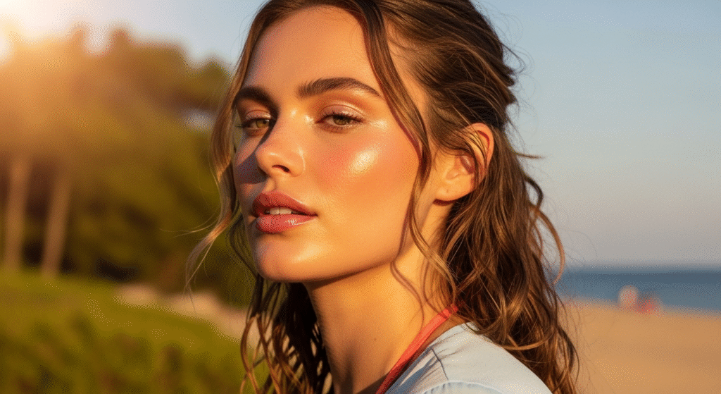 Switch to glossy or tinted lip balms — light pinks, peaches, or nudes look dreamy in sunlight.